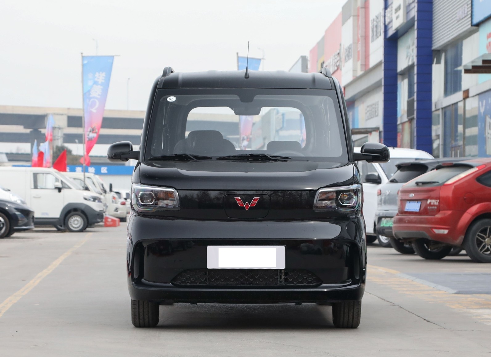 我们首先来看新车的外观设计方面,车头造型作为新能源身份通过无格栅设计明确传递,五菱红标居中布局,充电口隐藏于LOGO后方,兼顾美观与功能性。基础版配备卤素大灯,305km进阶车型升级为LED光源,熏黑透镜搭配“舞狮灵眸”设计语言,提升夜间照明效果,档次感也似乎有着提升。下方厚重的前保险杠无复杂线条,降低维修成本,熏黑的进气格栅也能够增加运动感。并且充电口支持3.3kW外放电,可直连咖啡机、烤肠机等商用设备。