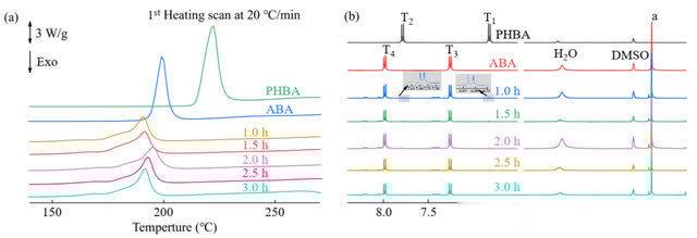 综上所述配资广告,本工作通过1H-NMR对酰化产物进行了测试,明确不同种类单体酰化后的组成,并对各组分进行了定量分析。对于不对称官能团PHBA,在乙酰化过程中发生了自聚反应,且在酰化条件下反应3 h内达到反应平衡。对于对称双官能团BP,其乙酰化过程分步进行最后,无论是官能团不对称型单体-PHBA还是官能团对称型单体-BP,乙酰化程度均随酰化时间的延长逐渐增大并趋于平衡。
